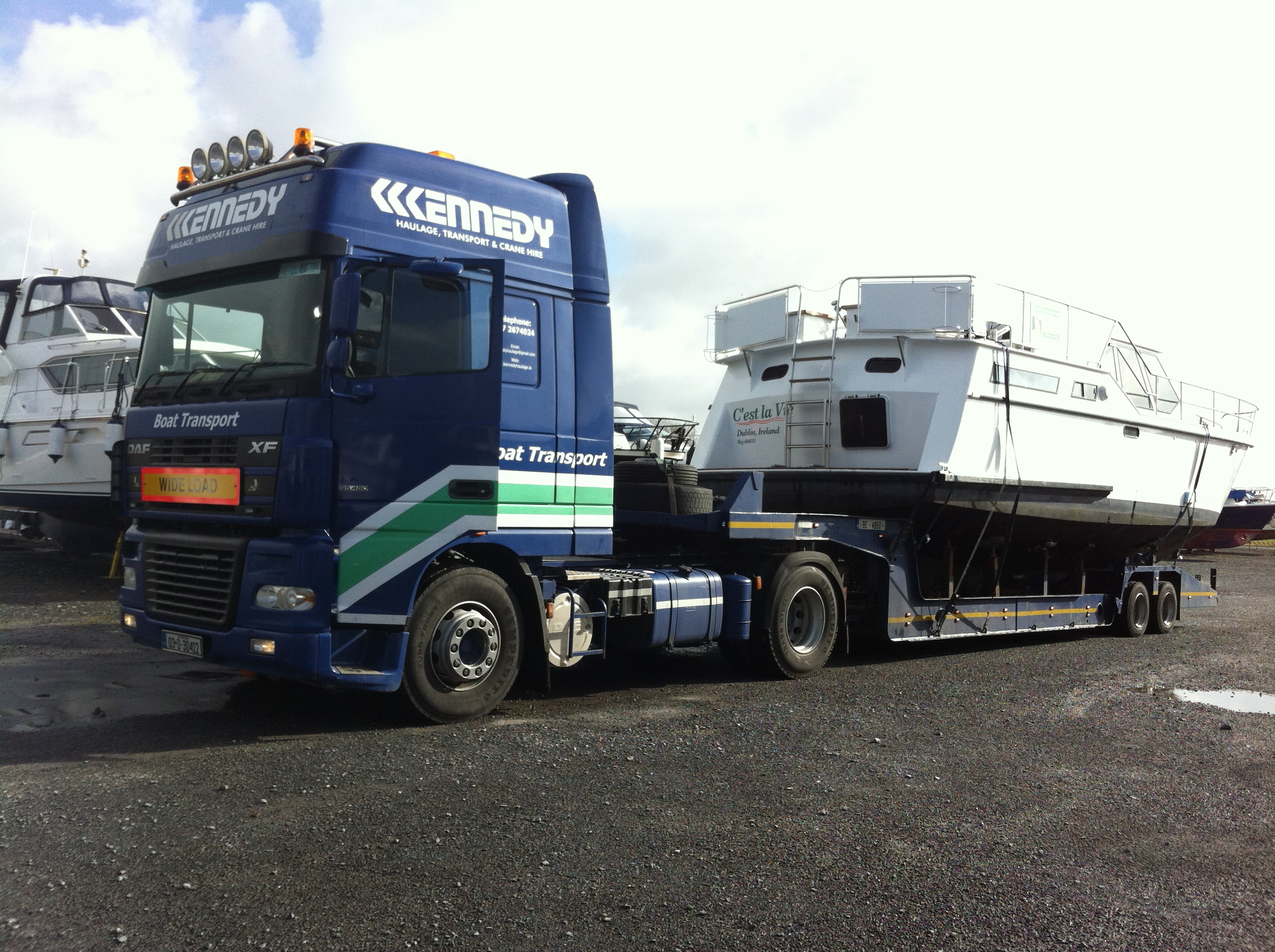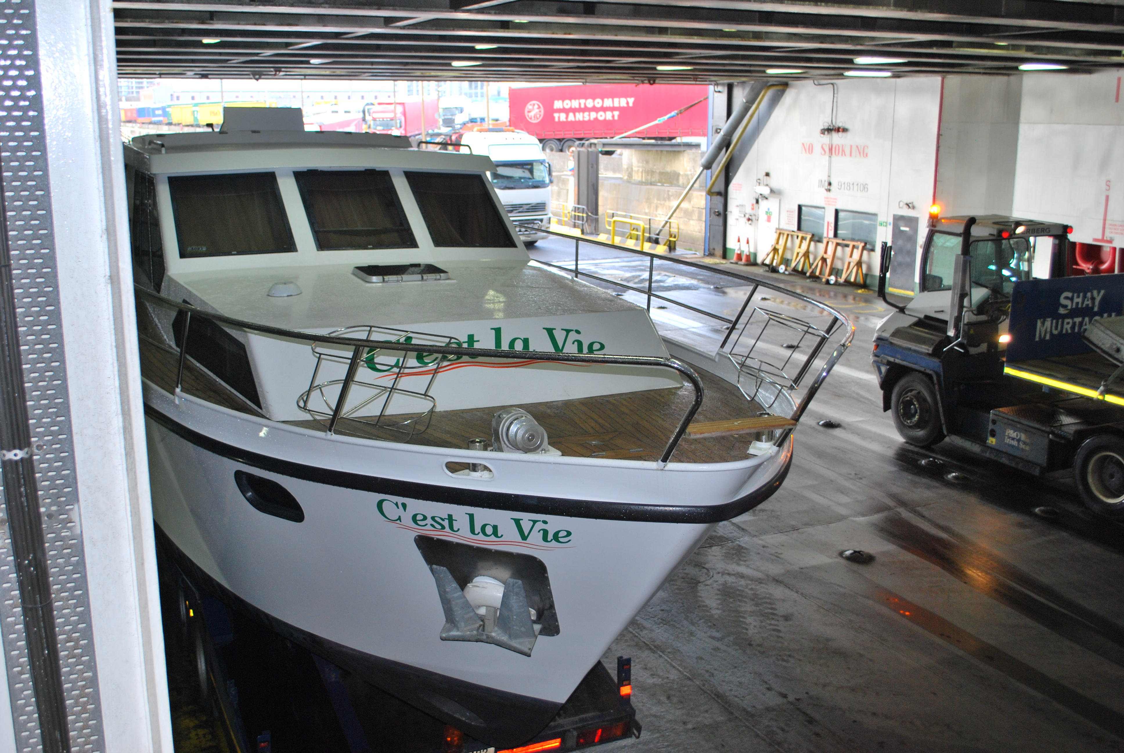 We arrived in Dublin Port at 1.40 pm in plenty of time and reversed safely on board. Under the lunacy of the rules in Ireland, the wide load was not allowed to use the Port Tunnel and we had to wind our way through the roads of Dublin to the port. It was interesting to see the stares of people on the footpath as our large boat and support truck inched their way through the streets. Jonathan says this happens to him all the time.