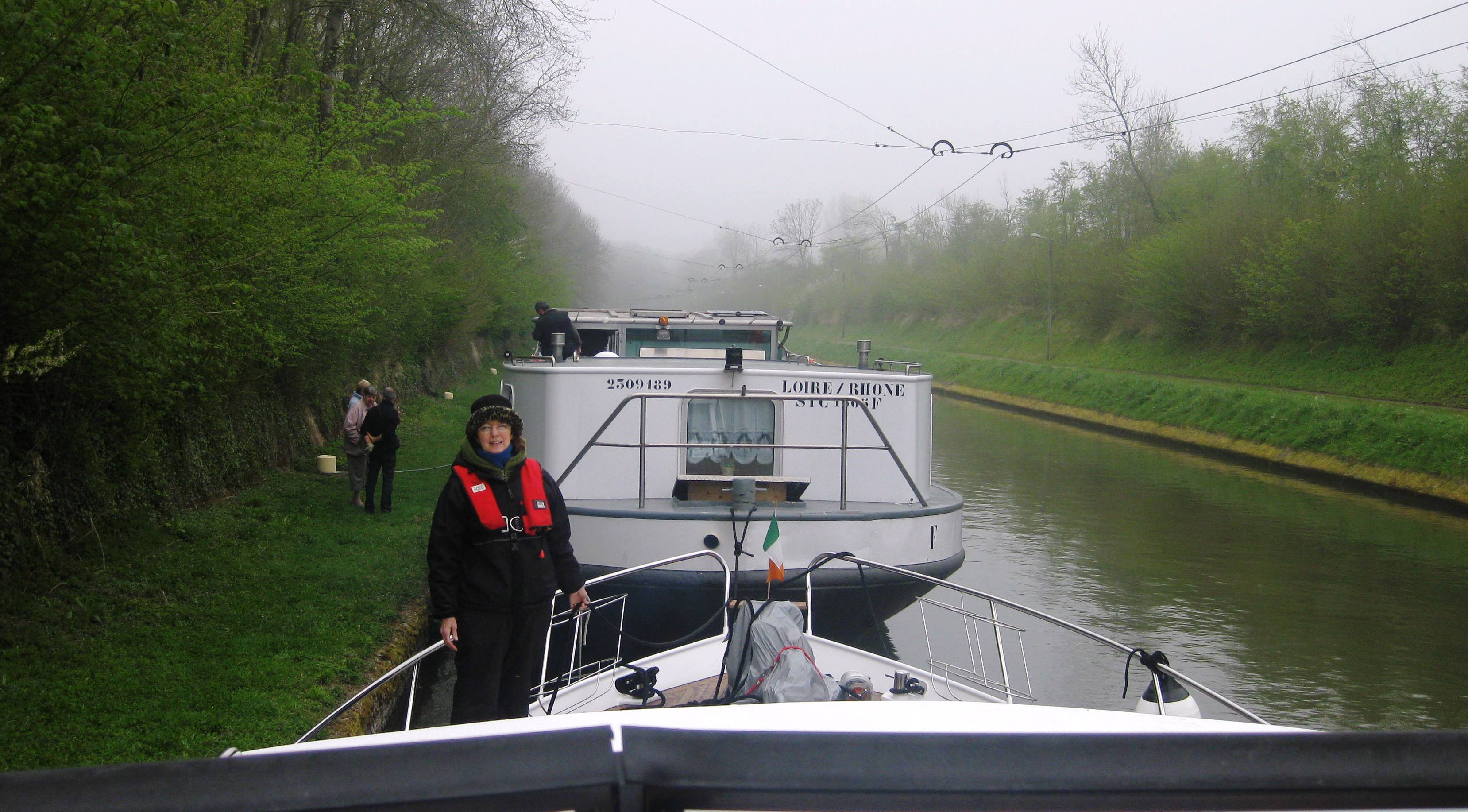 On Saturday morning at 8.15 am we left Vendhuile where we had moored overnight along an old quay wall, to be as close as possible to the starting point. It was very foggy and the South bound tow was leaving at 9.30 am. Tam and Di had given us great advice- told us we needed to make up a tow rope of at least 30 meters length, take down the canopy and radio arch and put towels on the high guard rails to protect them. They warned us that we would most likely be at the end of the tow and that the boat could bang off the tunnel walls if we were not careful.