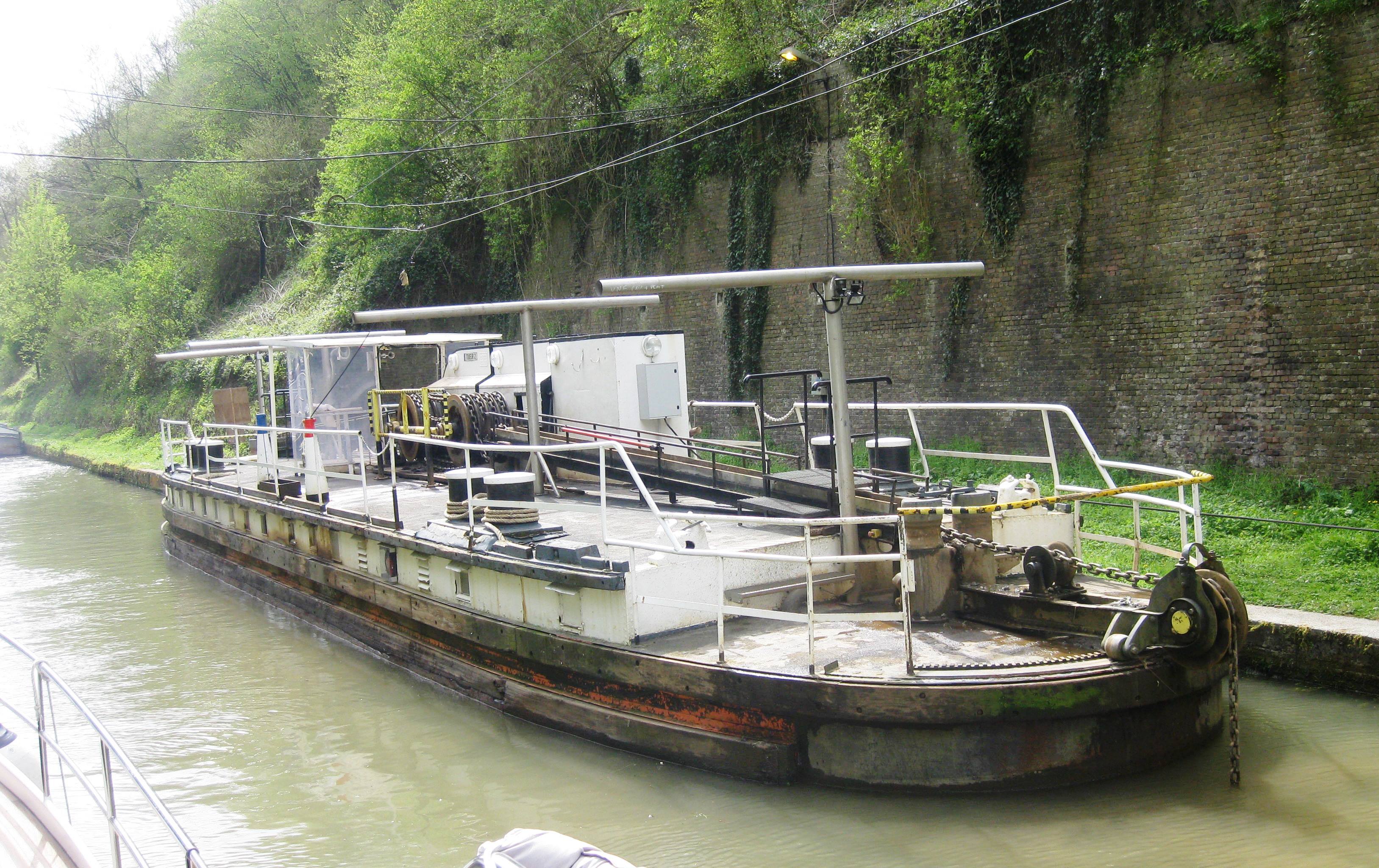This is a 5.6 km tunnel through the mountains on the St Quentin Canal. All the boats have to turn off their engines to be roped to the boat in front, and pulled through the tunnel by special chain driven electric tugs. The fully laden barges go first, then the empty ones ,then pleasure boats in order of their size…… with us last.