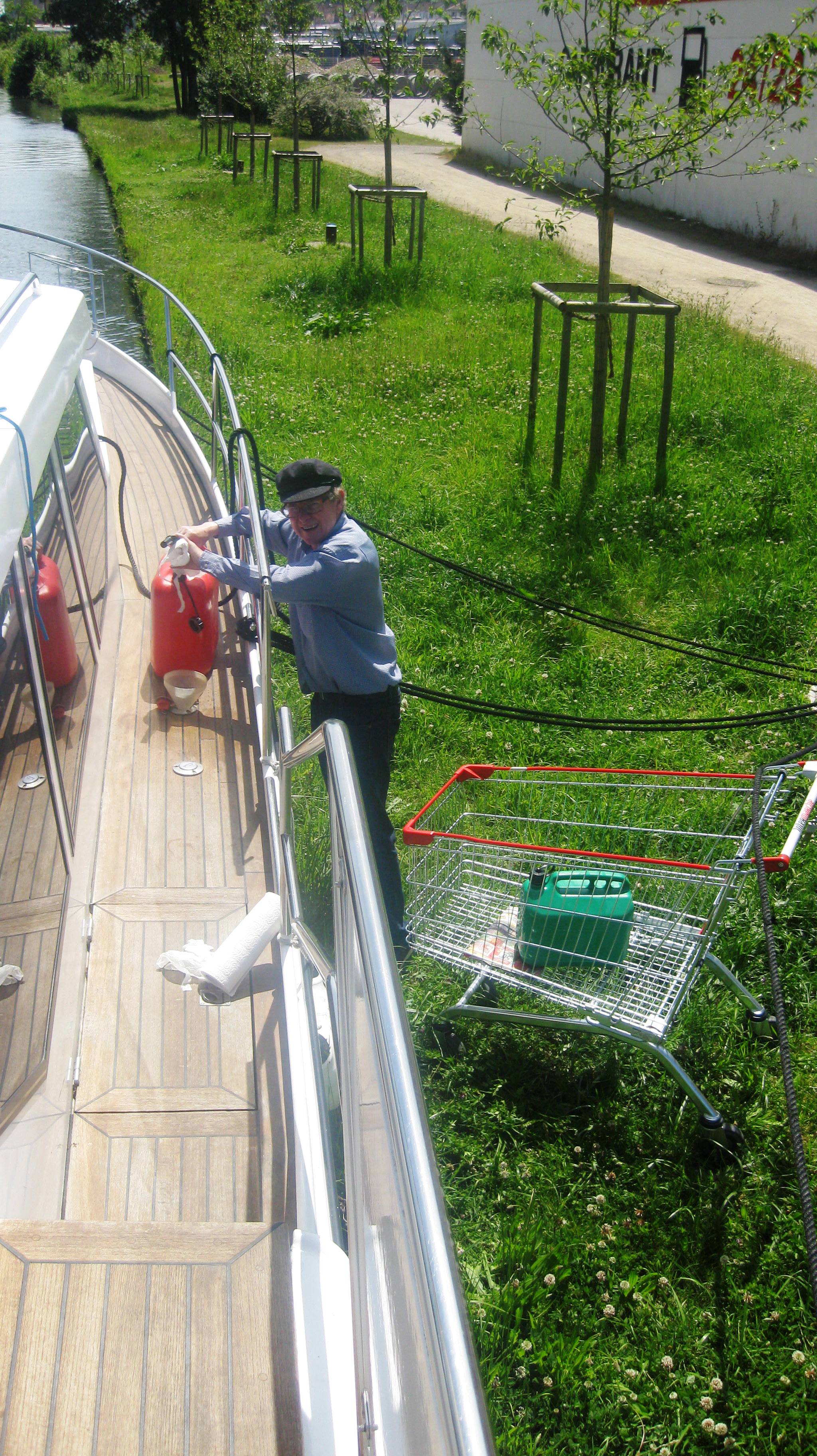 Three trips later I had 95 litres in the boat. It was very hot and heavy work so I eventually gave up. I still need another 650 litres to get us to Berlin and back to Nancy, so unless I can find an oil distributor who will deliver to the boat before I leave France, it will be back to the cans and another 20 trips with a shopping trolley!