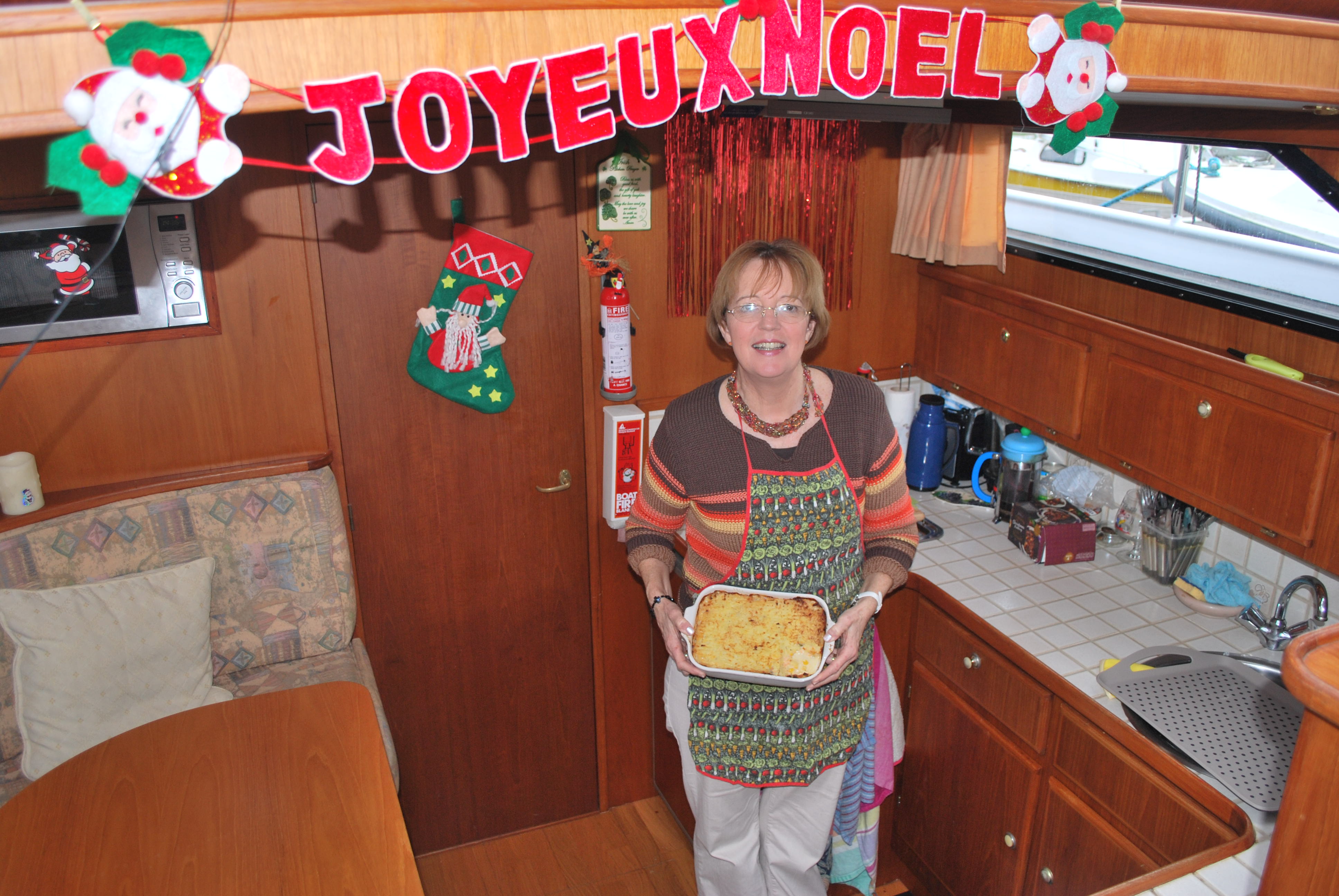 Last Monday, we had nine people for dinner. I made it more difficult for her as I don’t eat meat. So Nuala decided to make fish pie. Preparations started on Sunday when we went to the market to buy the fish. Nuala made starters of toasted baguette nibbles, fish pie for main course and cheese and cakes for desert. Nuala prepared the fish pie on Sunday evening. This left Monday free to clean up the boat before our visitors arrived.
