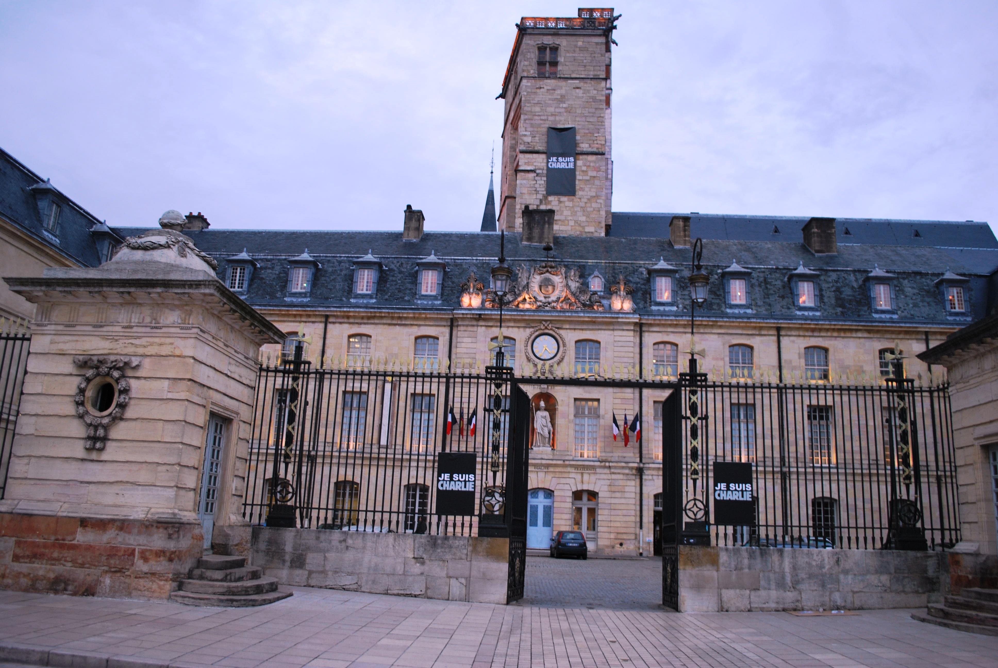 The front of the Hotel de Ville part of the Palais du Ducs- note the Je Suis Charlie banners on gate and tower