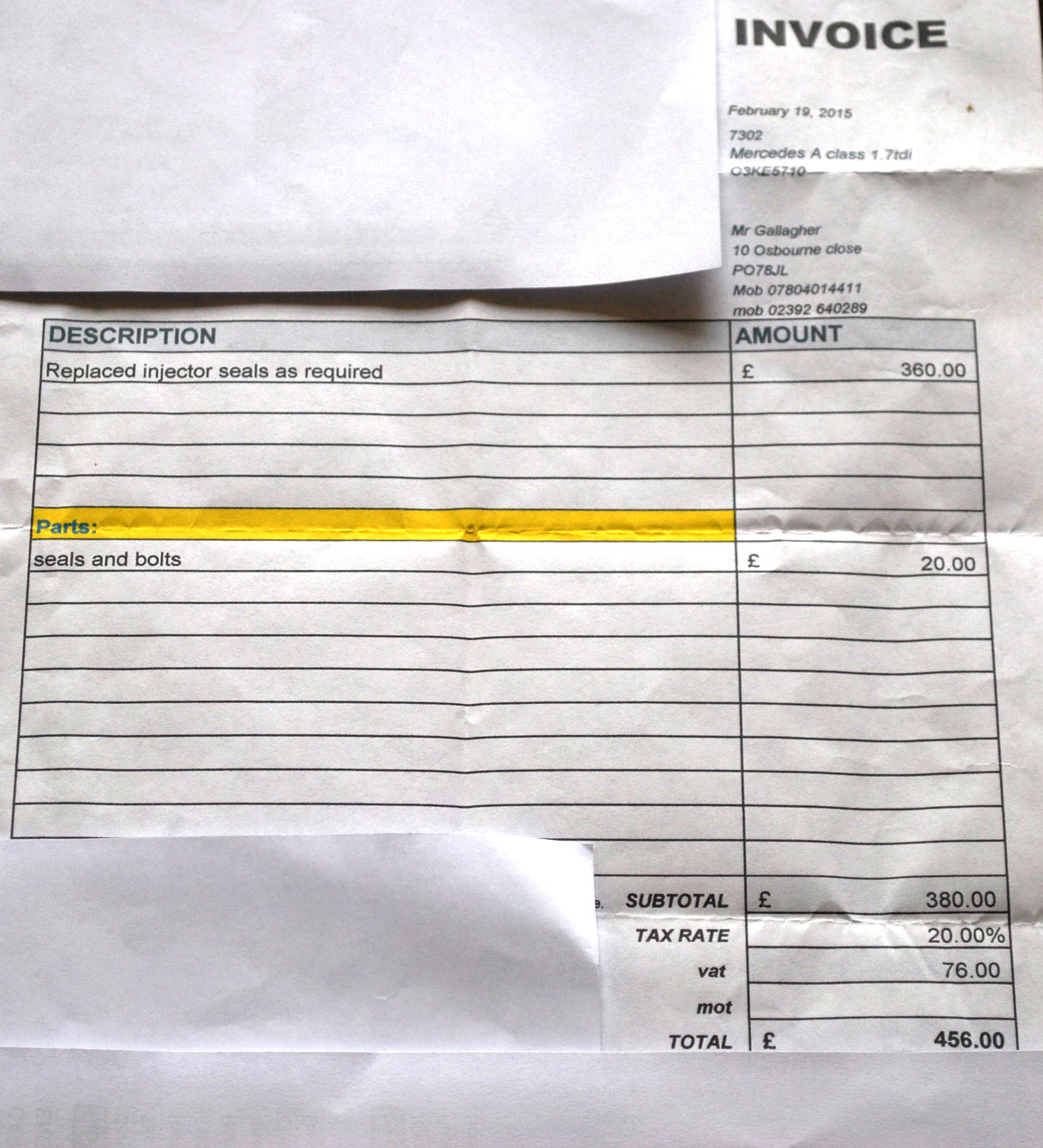 The car has been in a Dublin garage until yesterday. This garage we know well and trust. They charged €524.90 as they had to open up the injectors and replace the seals. They have told me, that in their view, the seals were never replaced and they don’t think the turbo was ever taken off the engine. (Without taking the turbo off, you cannot replace the seals). Naturally they don’t want to get involved and don’t want to write a report but they did give me the old seals and parts.