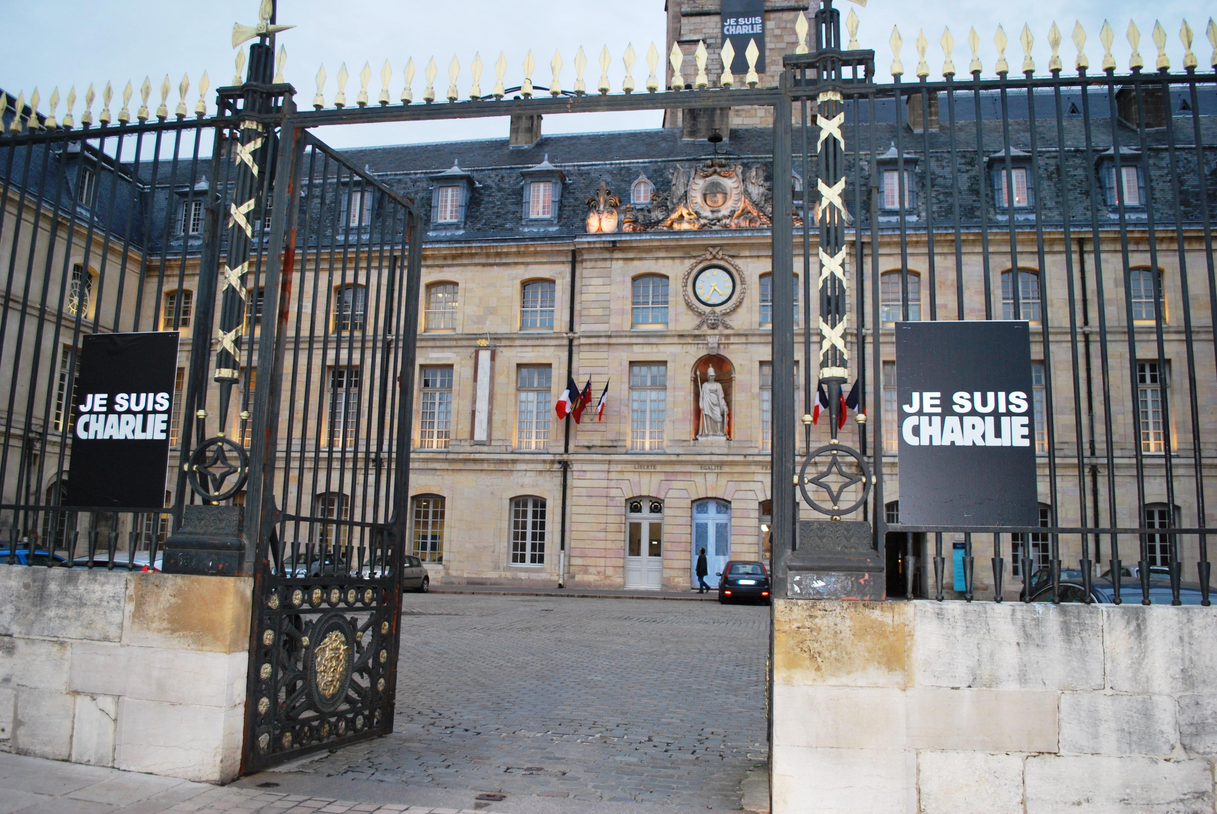 Je Suis Charlie signs outside the Hotel De Ville in Dijon this week
